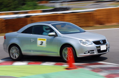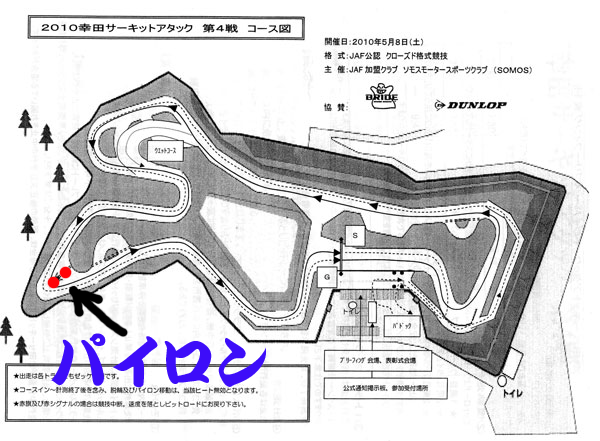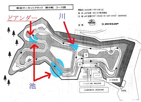 | 練習走行2回目:上の図の”どアンダー”の部分で注意していたのに ハイドロプレーンの餌食になってしまいました。 思いっきり減速したのにクルマは曲がらず・・・! (普通なら一気にコースアウト、でも今回は超低速なので 「やばい・ヤバイ!」と思わず叫んでしまいました。 ぎりぎりコースアウトは避けれたけど結果は、最悪です。 でも、アウトしなくて良かったぁ |