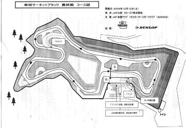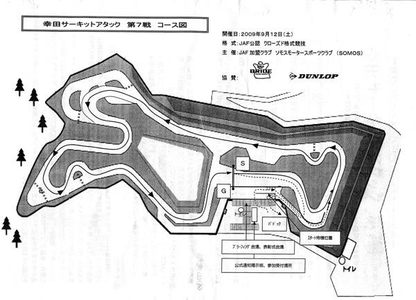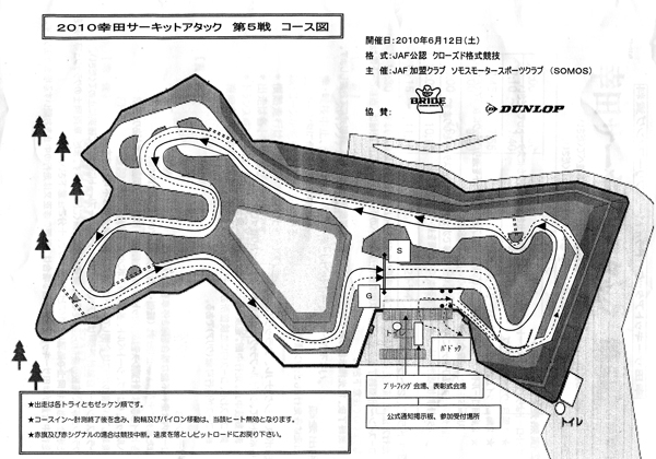 | CIRCUIT ATTACKです 上の図が今回のコースです クルマは、ゴルフワゴンにKWの車高調整式ショックアブソーバー+スプリング そして、TAKATAのフルハーネスを取り付けただけ、 ヘルメットはアライのGP-2K グローブはARD(品名は?)こんな軽装で走ります。 以前、M3で走ったのを基にゴルフならこんな感じだろうと思っていたら… 予想以上に走らないし、脚も柔らか過ぎでした。 |